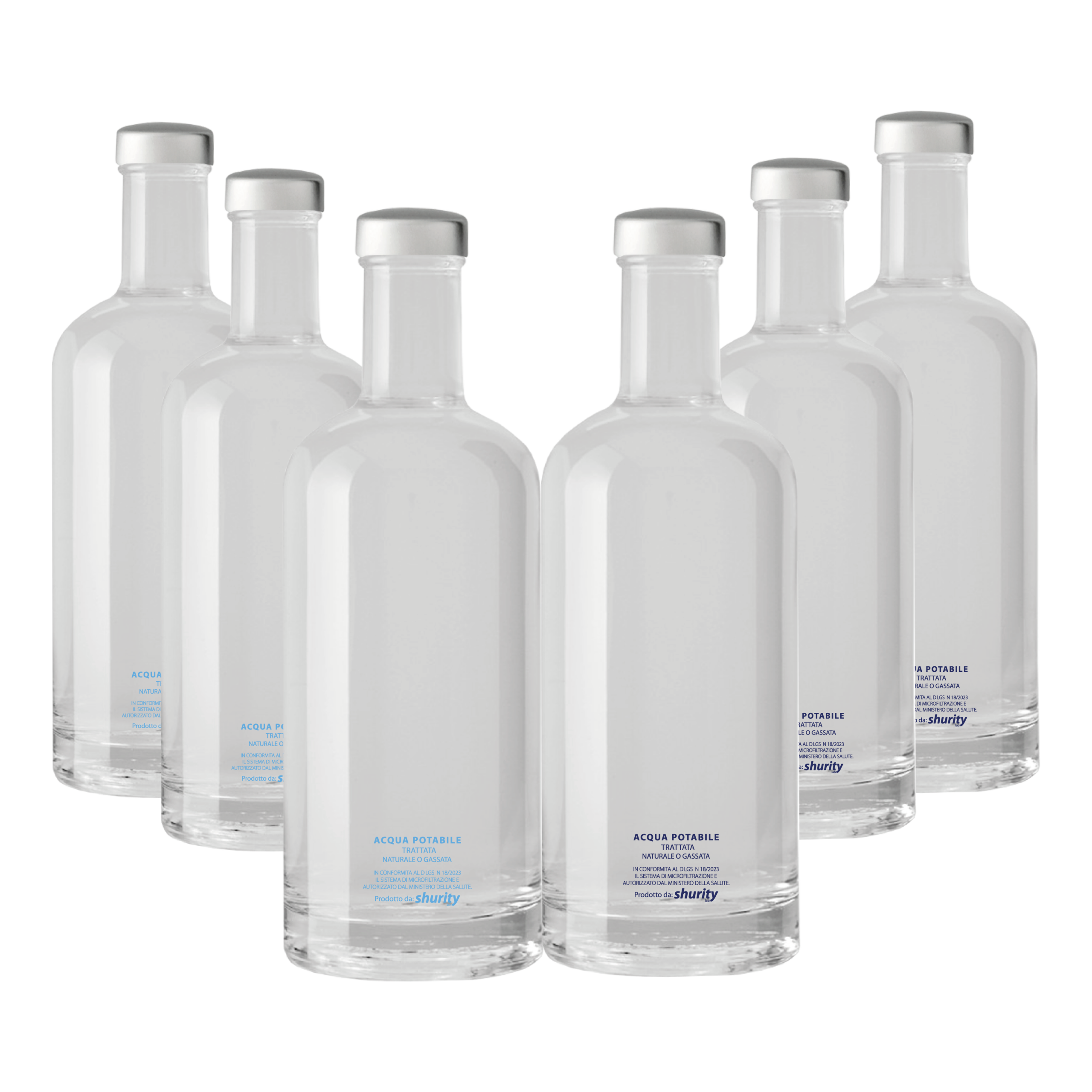 Pack Misto 6pz. – Bottiglia Shurity Basic 75cl. Personalizzata Trasparente Acqua Liscia / Acqua Gassata con Tappo Argento