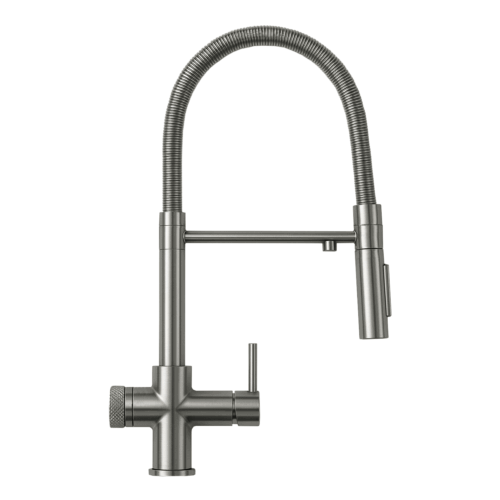 Shurity 488 Rubinetto da cucina con Doccetta 4 vie Acciaio Inox Senza metalli pesanti 3/8” Nickel Spazzolato Rubinetto in Acciaio Inox SENZA METALLI PESANTI. Con canna a molla e doccino estraibile! • La levetta dell’acqua di rete ha un’escursione di 7cm. Caratteristiche: Tipologia: 4 Vie Dimensioni (HxL): 50 x 26 cm Colore: Nickel Spazzolato Peso: 3kg Connessioni: • 2 Flessibili 3×3/8” • 2 attacchi 1/4″ (acqua depurata)